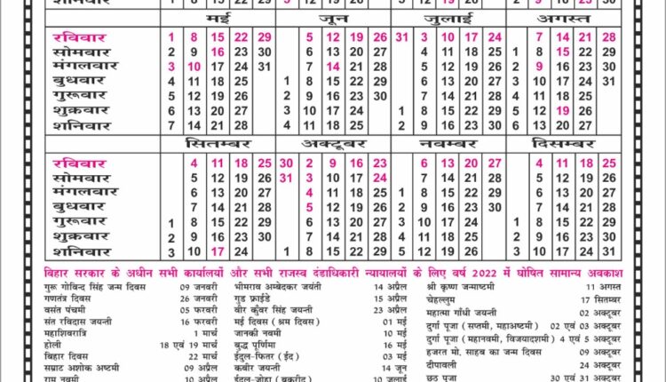 पटना (voice4bihar desk)। वर्ष 2022 का बिहार सरकार का कैलेंडर आ गया है। इसमें राज्य सरकार के कर्मियों के लिए 32 सार्वजनिक अवकाशों और तीन एच्छिक सहित कुल 35 छुट्टियां हैं। हालांकि इनमें नौ छुटि्टयां रविवार को और छह छुटि्टयां शनिवार को पड़ रहीं हैं। सचिवालय और निदेशालय के कर्मियों के नये साल की शुरुआत ही छुट्टी के साथ हो रही है। अर्थात् एक जनवरी को शनिवार है।