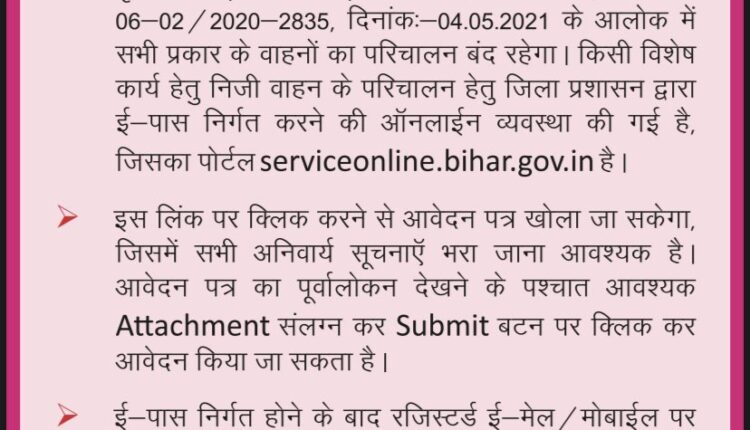 वाहन ई-पास के लिए serviceonlin.bihar.gov.in पर ऑनाइन आवेदन करना होगा। इस लिंक को क्लिक करने पर आवेदन पत्र खुलेगा। इस आवेदन पत्र में सभी अनिवार्य सूचनाओं को भरना होगा। आवेदन पत्र को ठीक ढंग से भर लेने के बाद आवश्यक अटैचमेंट संलग्न कर सबमिट बटन को क्लिक कर देना है। सबमिट बटन को क्लिक करते ही आवेदन पत्र संबंधित विभाग में चला जायेगा।