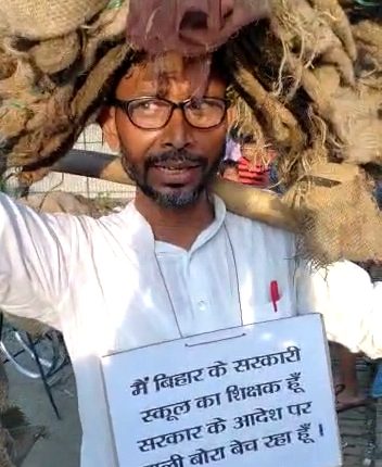 दरअसल, कटिहार के प्रारंभिक शिक्षक संघ के जिलाध्यक्ष मो. तमीजुद्दीन का एक वीडियो वायरल हो रहा जिसमें वे बोरा बेचते नजर आ रहे हैं। वीडियो में सिर पर बोरा की गठरी लेकर शिक्षक तमीजुद्दीन लोगों से बोरा खरीदने की अपील करते हुए कह रहे हैं कि अगर वे बोरा नहीं खरीदेंगे तो उन्हें वेतन नहीं मिलेगा।