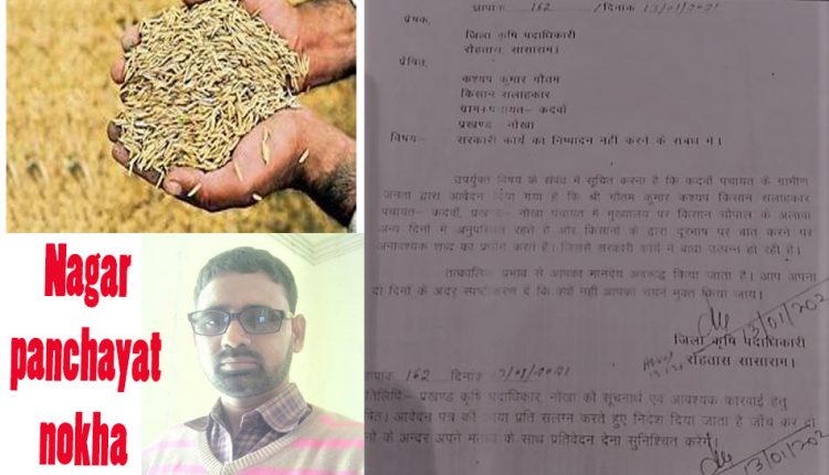 केंद्रीय राज्य मंत्री अश्विनी चौबे की मौजूदगी में स्थानीय समाहरणालय परिसर में आयोजित दिशा की बैठक में नोखा प्रखंड प्रमुख ललित चौधरी ने कदवा पंचायत के किसान सलाहकार के विरुद्ध किसानों में व्याप्त आक्रोश के आलोक में कार्रवाई की मांग जिला पदाधिकारी धर्मेंद्र कुमार से की थी।