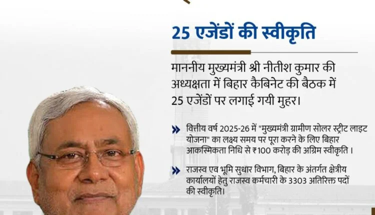 पटना (voice4bihar news)। मंगलवार को मुख्यमंत्री नीतीश कुमार की अध्यक्षता में हुई कैबिनेट की बैठक में 3303 राजस्व कर्मियों के पद सृजन समेत कुल 25 एजेंडों पर मुहर लगी। राजस्व एवं भूमि सुधार विभाग के अंतर्गत क्षेत्रीय कार्यालयों में तैनाती के लिए राजस्व कर्मचारी के 3303 अतिरिक्त पदों की स्वीकृति दी गयी है।