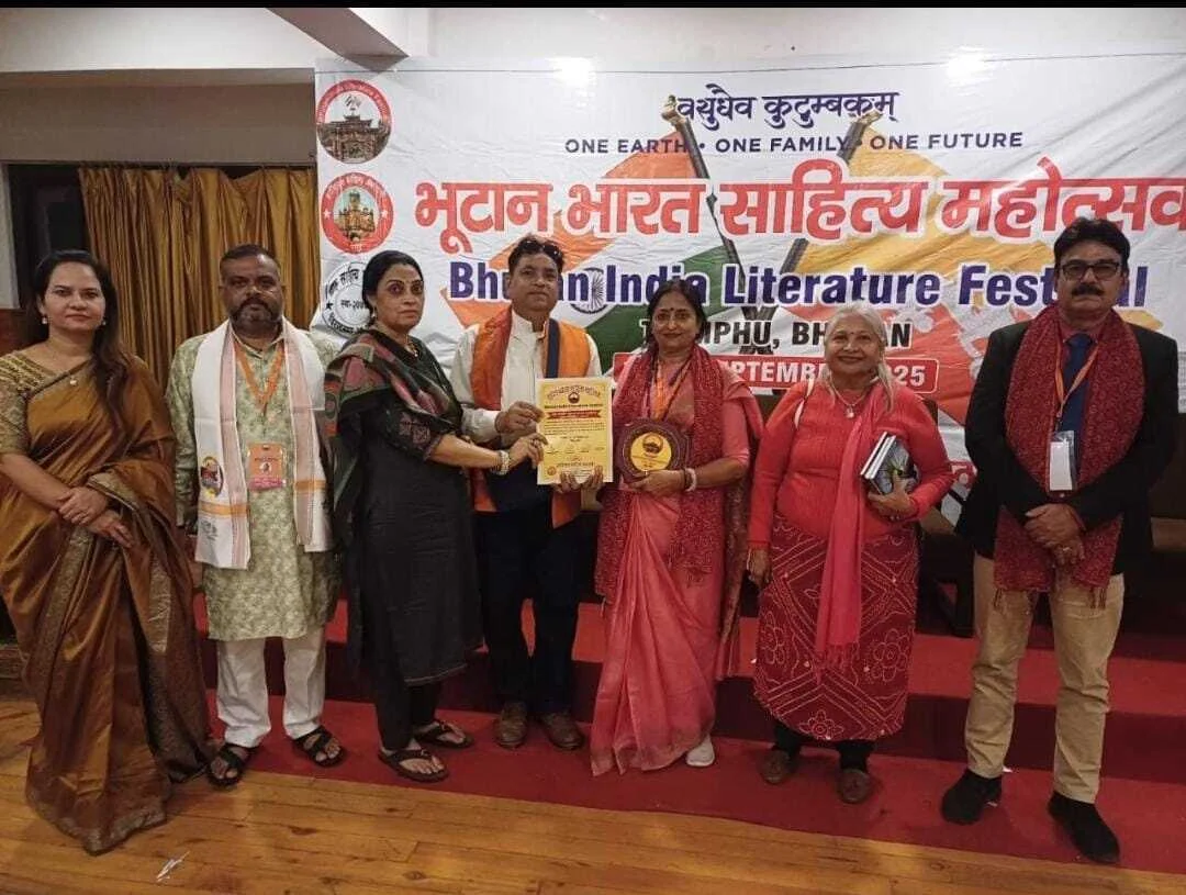 हाजीपुर (Voice4bihar News)। राष्ट्रीय हिंदी दिवस के मौके पर 12 सितंबर से लेकर 17 सितंबर तक भूटान देश की राजधानी थिंपू में आयोजित भूटान-भारत साहित्य महोत्सव का आयोजन किया गया, जिसमें बिहार की सुप्रसिद्ध कवयित्री हाजीपुर निवासी डॉ. रेणु शर्मा को भी काव्य पाठ के लिए आमंत्रित किया गया। मेरठ की साहित्यिक संस्था क्रांतिधारा साहित्य अकादमी की ओर से यह कार्यक्रम आयोजित था।